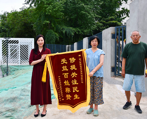 2021年9月6日,武侯区中亚花园科技村居民代表将一面写着“修堤关注民生,受益百姓称赞”的鲜红锦旗赠予四川能投宜居水岸建设有限公司,感谢为保障清水河五大花园段附近小区居民生命财产安全及打造舒适的生活环境作出的努力。