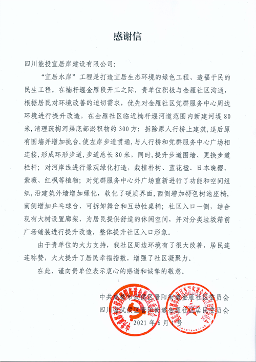 6月1日,公司收到来自武侯区晋阳街道金雁社区及居委会的联名感谢信,信中社区居委会就我公司对楠杆堰金雁段河道的精心治理,表示衷心的感谢。项目通过对河渠清淤、河堤新建、步道贯通、植树育花等方式,为群众提供舒适的休闲空间及便捷的出行条件。