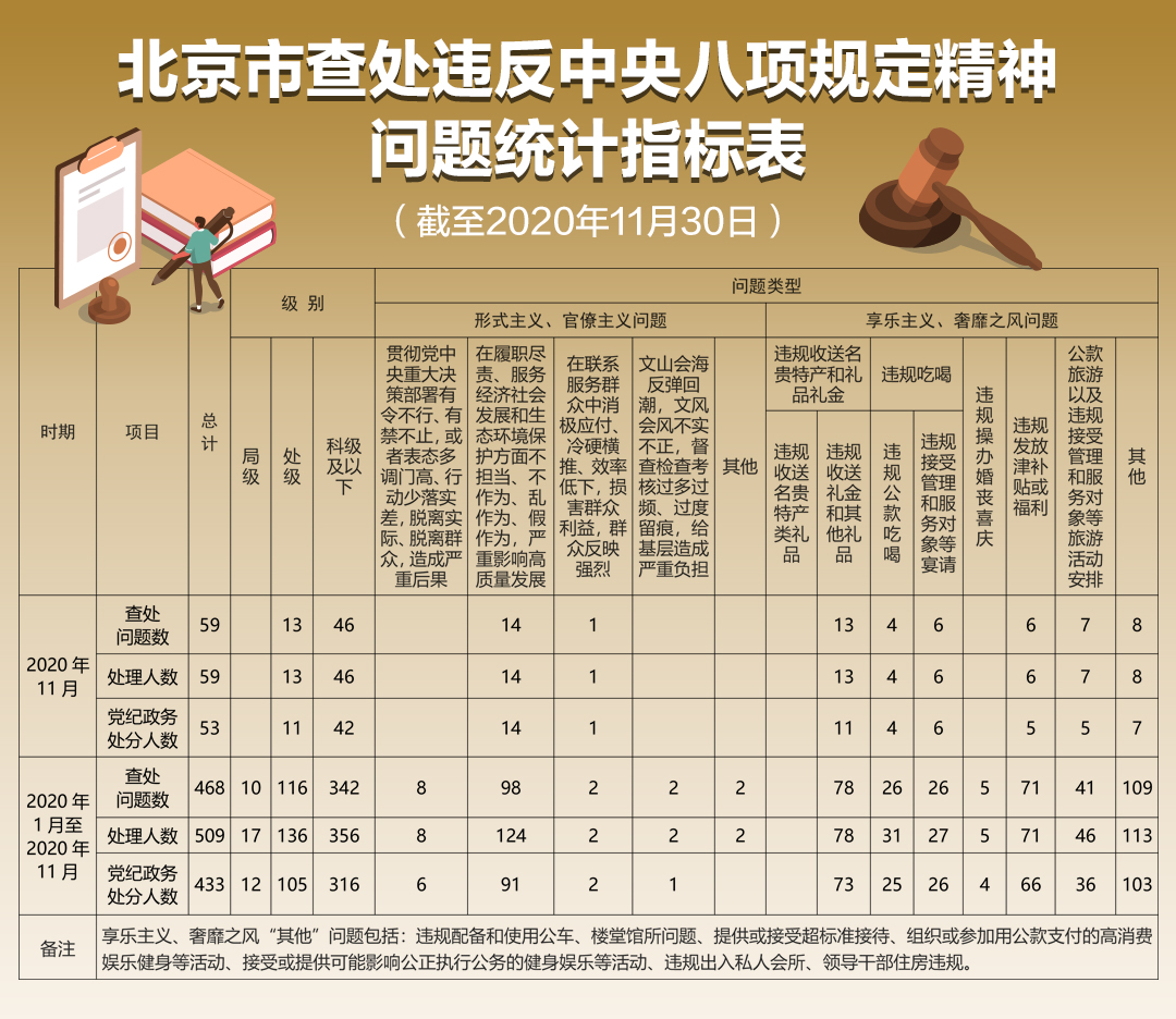 日前,北京市纪委监委公布今年1月至11月查处违反中央八项规定精神问题统计指标表。截至11月30日,北京市累计查处违反中央八项规定精神问题468个,处理509人,其中局级17人、处级136人、科级及以下356人。