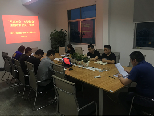 为积极贯彻落实水务公司“不忘初心、牢记使命”主题教育实施方案,学深悟透习近平总书记新时代中国特色社会主义思想。2019年6月18日,南江川能投开源水务有限公司组织全体人员集体学习了《川能水务“不忘初心、牢记使命”主题教育实施方案》总体部署和具体要求及张忠武董事长在川能水务“不忘初心、牢记使命”主题教育动员部署会议上的讲话精神。