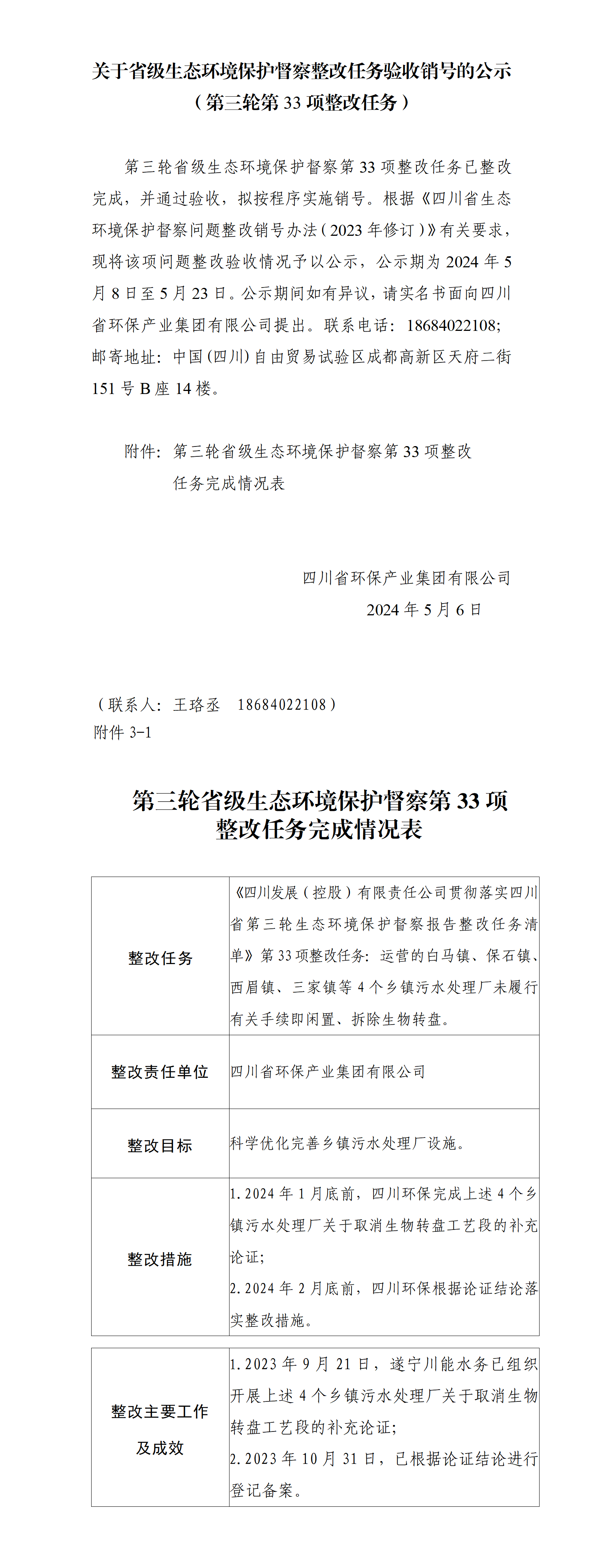 关于省级生态环境保护督察整改任务验收销号的公示 (第三轮第33项整改任务)